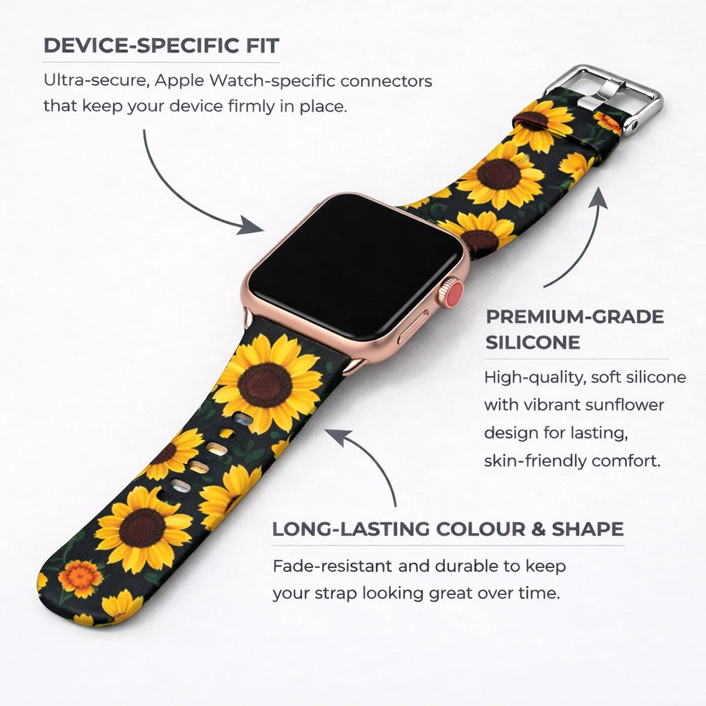 The Pattern Apple Watch Straps not only feel really comfortable against the user's skin, but each Black Sunflower Pattern band will also come complete with a hard-wearing silver buckle connector as standard. This will always make sure that your new Apple Watch Strap not only looks fantastic but will always keep your watch protected and secure by making sure it always stays snugly attached to your wrist.