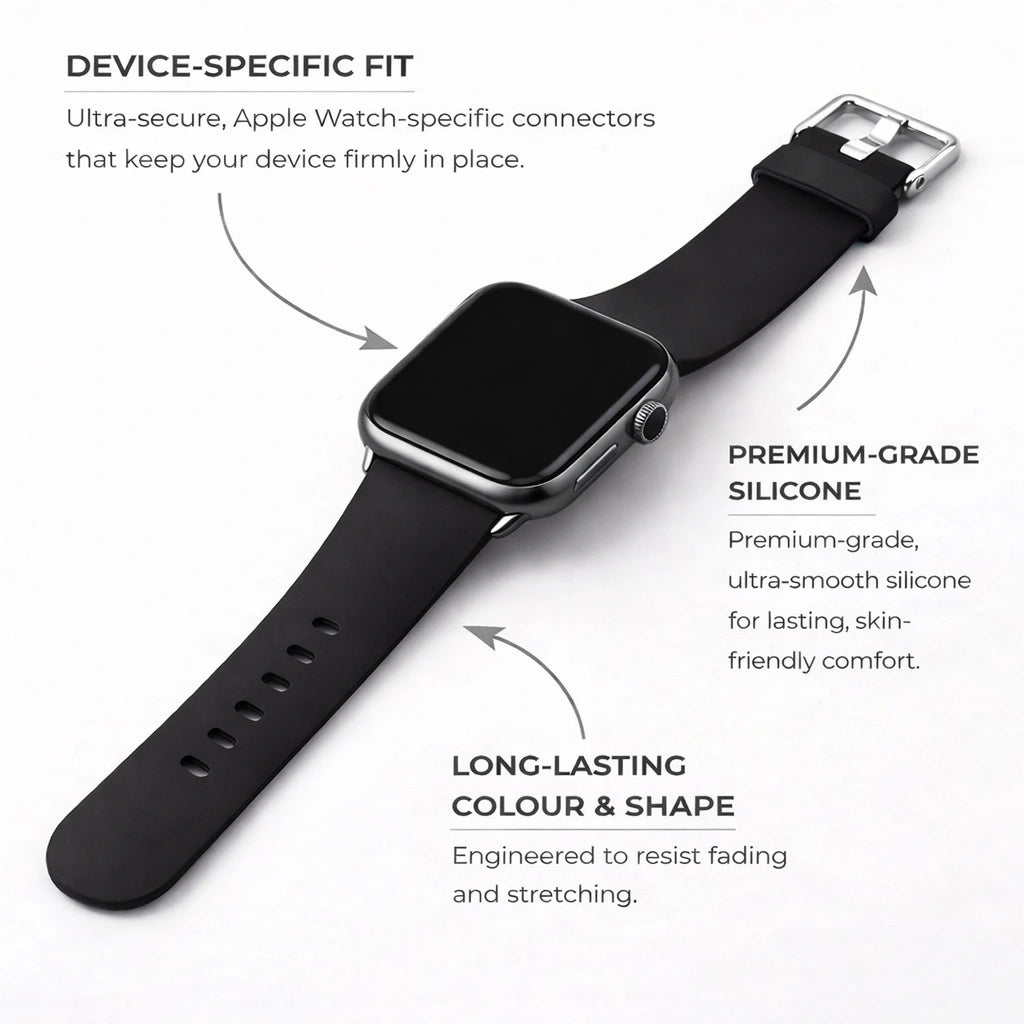Level up your Apple Watch style and match your fresh new black silicone strap to whichever outfit you wear that day. Choose from our most Popular straps and find the ideal look to suit your daily fashion choices. Fitstraps stocks the biggest selection of every look of Apple Watch Bands suitable for every version of the Apple Watch Series. Apple Watch Series 1, 2, 3, 4, 5, 6, 7, 8 SE and Ultra.