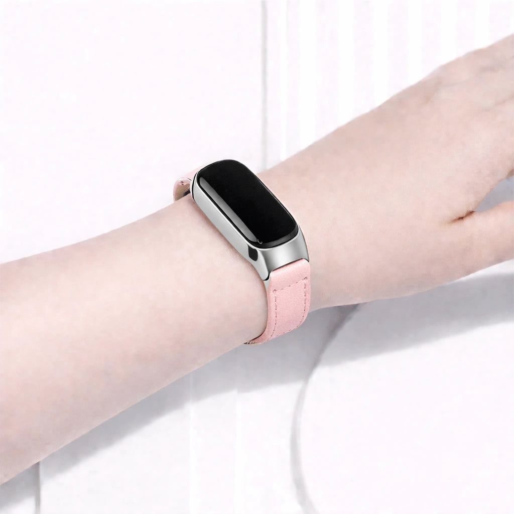 Pink leather wristband fitted to a Fitbit Inspire 3